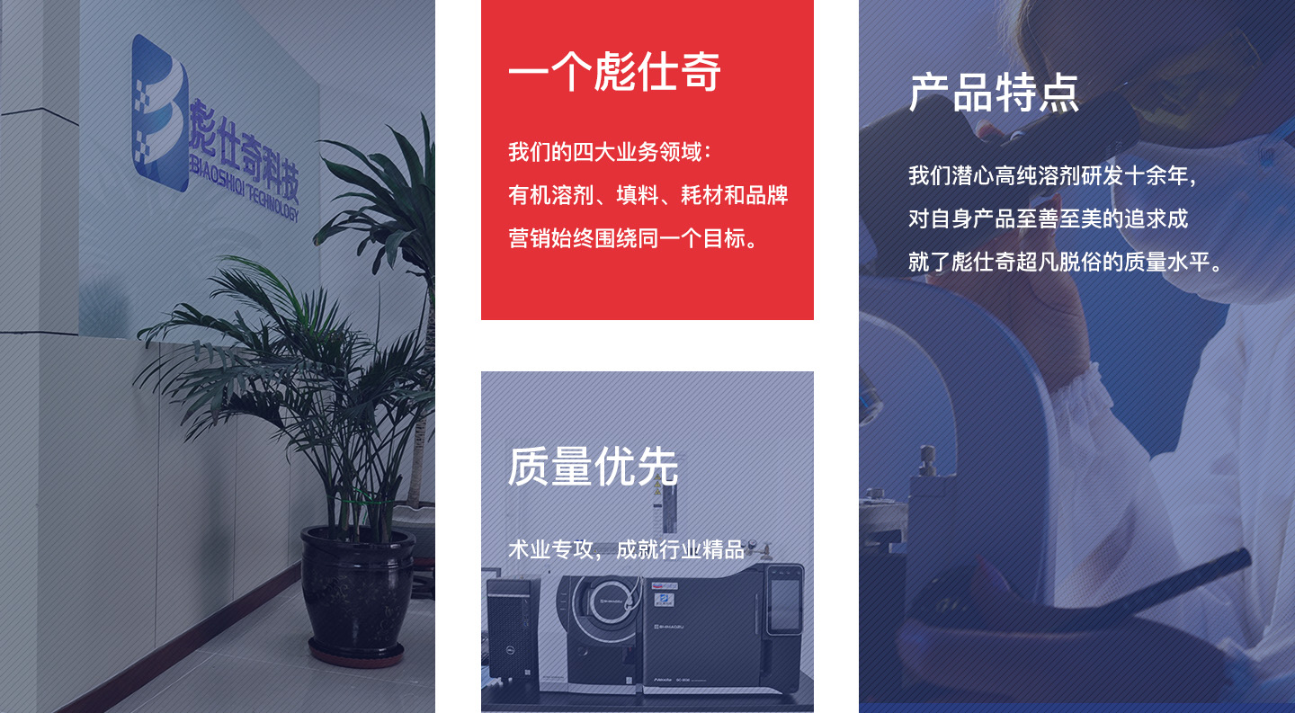天津市彪仕奇科技發(fā)展有限公司成立于2005年,是一家致力于色譜溶劑的生產(chǎn)、研發(fā)和銷(xiāo)售的企業(yè),擁有優(yōu)質(zhì)的化工產(chǎn)品和精密的分析檢測(cè)儀器,同時(shí)具備安全作業(yè)的環(huán)境、一定水平的技術(shù)和管理及配套的軟件資源。并于同年推出“彪仕奇”品牌色譜溶劑。